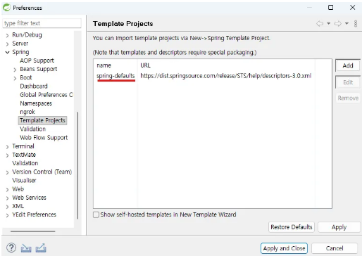 spring-defaults만 남기고 Apply 한 뒤에 Refresh를 눌러 ‘Spring MVC Project’ 메뉴를 확인한다.