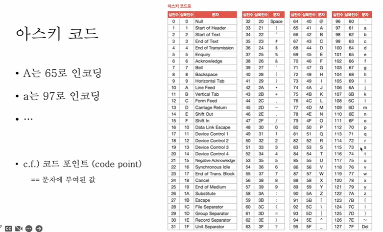아스키 코드 - 초장기 문자 집합 중 하나 - 알파벳, 아라비아 숫자, 일부 특수 문자 및 제어 문자 - 7비트로 하나의 문자 표현 > 8비트 중 1비트는 오류 검출을 위해서 사용되는 패리티 비트(parity bit)