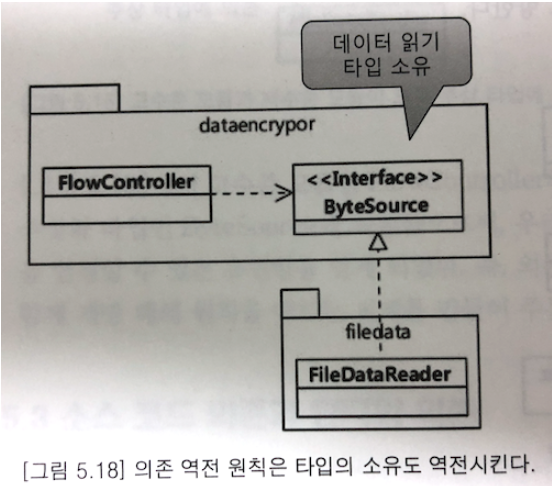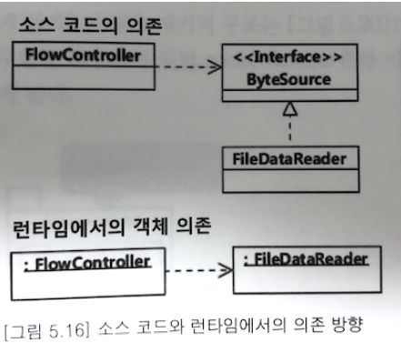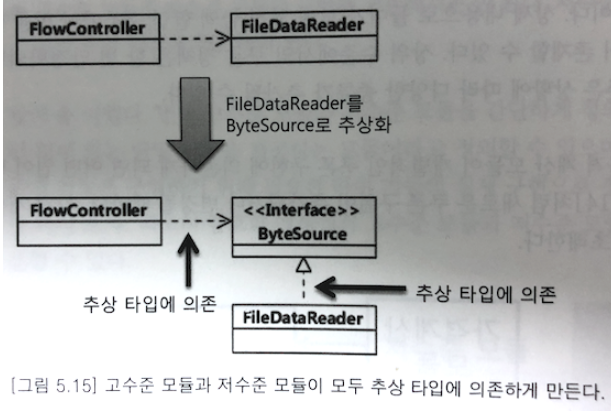 그럼 기존에 고수준 모듈인 FlowController 이 저수준 모듈 FileDataReader에 의존했던 상황에서, 이제는 FlowController 에 의해 만들어진 ByteSource에 FileDataReader가 의존하는 상황으로 변화하였다.