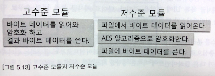 이 고수준 모듈은 데이터 읽기, 함호화, 데이터 쓰기라는 하위 기능으로 구성되어 있는데, 여기서 저수준 모듈이 이 하위 기능들을 실제로 어떻게 구현하는 것인지에 대한 책임을 다룬다.